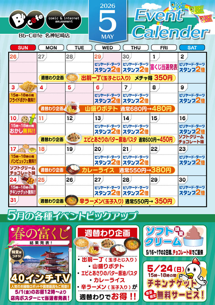 2026年5月イベントカレンダー2026.04.24Bbカフェ名神尼崎店の2026年5月イベントカレンダーです。◆ 5月3日 15時~18時の間 フライドポテト無料サービス実施致します!◆ 5月10日 15時~18時の間 お菓子無料サービス実施致します!◆ 5月17日 15時~18時の間 パンビュッフェ無料サービス実施致します!◆ 5月24日 15時~18時の間 チキンナゲット無料サービス実施致します!