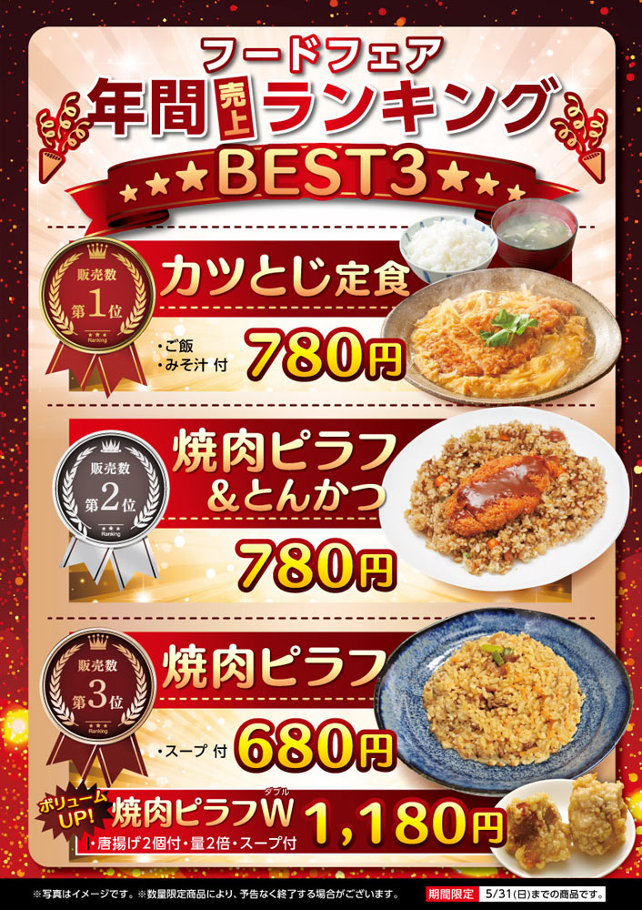 フードフェア 年間売上ランキング2026.04.6フードフェア 年間売上ランキング!BEST3 第1位 カツとじ定食 ●ご飯・味噌汁付 ・・・780円第2位 焼肉ピラフ&とんかつ ・・・780円第3位 焼肉ピラフ ●スープ付 ・・・680円ボリュームアップ! 焼肉ピラフW ●唐揚げ2個、量2倍、スープ付 ・・・1,180円