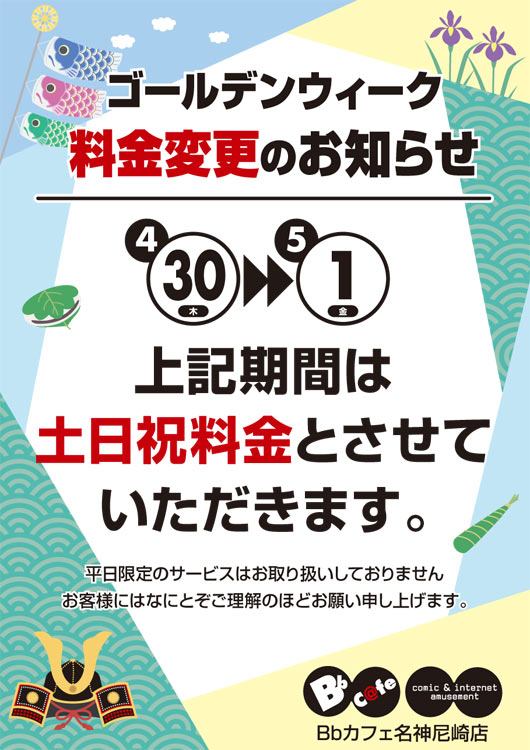 4/30(木)~5/1(金)の期間中は 土日祝料金とさせていただきます。 お客様には何卒、ご理解の程お願い申し上げます。