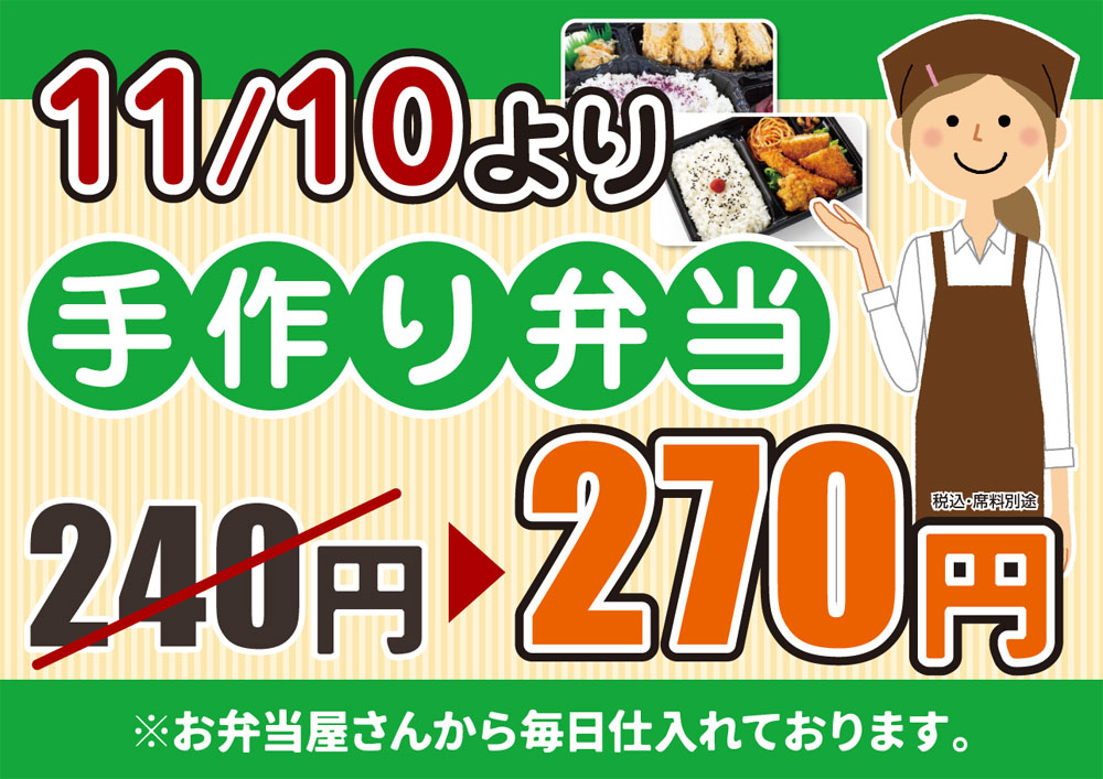 11月10日より 手作り弁当の料金が 240円から270円に変わります。